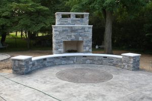 Outdoor fireplace with seating wall.